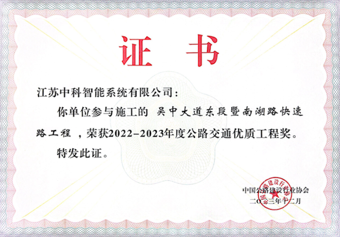 On January 13,2024, the fifth highway construction quality and highway traffic quality engineering award commendation congress held in Hubei Wuhan, by the subsidiary in Jiangsu zhongke intelligent system co., LTD. (hereinafter referred to as the "zhongke intelligent") cooperated-builing Wuzhong avenue east and south lake road expressway project, named 2022-2023 highway traffic engineering, zhongke intelligent as one of the winning project representatives attended the commendation congress.
